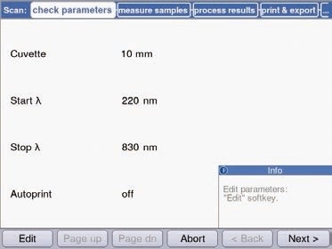 The parameters to be scanned are subsequently determined. The “Edit” soft key in the “Check parameters” area enables adjustment of the range of wavelength and the cuvette’s path length (Figure 6).