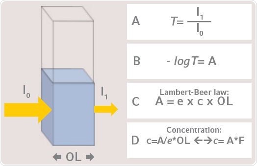 In order to evaluate the sample liquid concentration in a cuvette, the transmission (T) is first determined with a photometer, while measuring the ratio of ingoing light (I0) and outgoing light (I1) (Figure 2). The absorbance (A) value is the common negative logarithm of transmission. The absorbance that is measured is based on optical path length; specific sample factor; absorbance coefficient; and concentration. This forms the basis of the Beer-Lambert Law.
