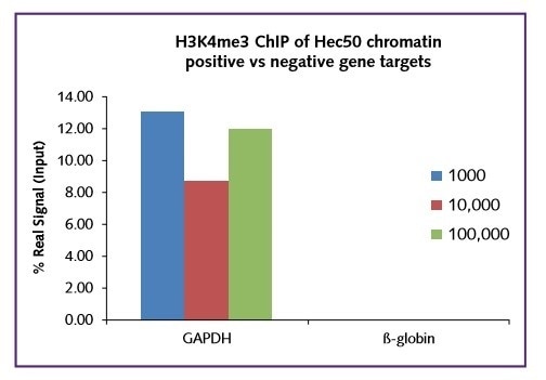 For all cell numbers used in the test, excellent signal was obtained in terms of occupancy of the histone mark H3K4me3 onto the target gene GAPDH (Figure 1).