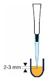 To aspirate the desired volume, the pipette should be dipped just below the liquid surface. If the tip is dipped too much, there is an increasing risk of carry-over as liquid drops can cling to the outer surface of the tip.