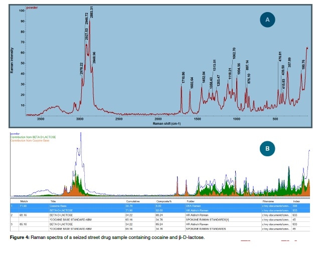 It is well known that street drugs are often mixtures and not pure substances. Figure 4 shows the results of analysis of a sample of some off-white powder in an evidence bag. A preliminary library search matched both lactose and cocaine, thus revealing that the sample was mixed. The next step was the OMNIC Specta multi-component search which identified the sample as a mixture of cocaine and β-D-lactose, the latter often being used as a cutting agent.