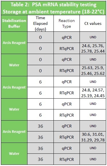Table 1 and Table 2 show data from Urine samples stored in Arcis preservation reagent. De-protection of the sample for molecular analysis is a single pipette step into Wash Buffer.