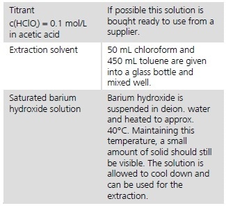 25 mL of the filtrate is placed into a 100 mL beaker and made up to 60 mL with ethanol. The solution is titrated with c(HClO4) = 0.1 mol/L in acetic acid until the first equivalence point is passed.