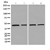 The image above shows HDAC11 western blot of Jurkat, HCT-116, MCF7 and HepG2 cell lysates using ab166907.