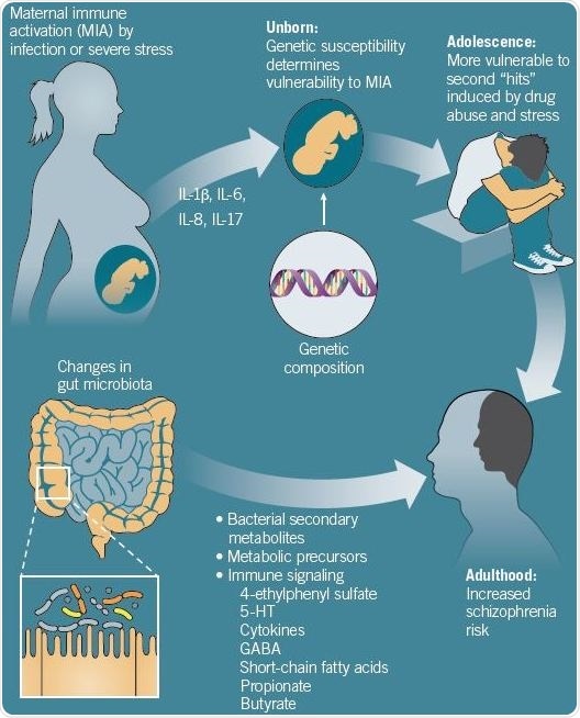 However, these animal models have identified several cytokines as critical mediators of maternal immune activation, which has been thought to cause dysbiosis of the offspring gut microbiota. These alterations, which are connected to prenatal insults influence schizophrenia-related phenotypes in the adult offspring.