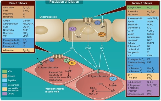 Chemical messengers, which circulate in the plasma, as well as locally released mediators from endothelial cells or perivascular nerves, may also behave as directly acting vasodilators via interaction with GPCRs of both Class A and Class B expressed on smooth muscle.