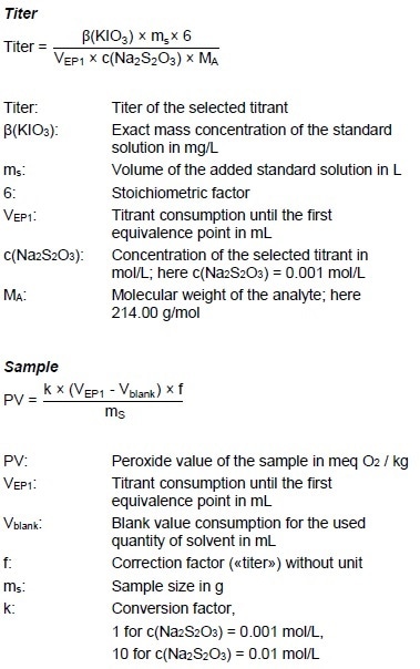 An appropriate amount of sample (see the below calculation) is put into the titration vessel and dissolved in 10 mL acetonitrile. Next, the beakers are covered and the solution is stirred for 30 seconds using stirring rate 8. 10.0 mL TSI solution are added and the sample is covered again and the mixture stirred using stirring rate 4. 0.5 mL distilled water is added after 5 minutes, the lid is closed again and the solution is stirred for another minute using stirring rate 4.