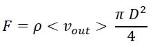 The mass flowrate F via a circular orifice of diameter D is given by the product of the mean speed of the grains <vout>, the aperture area, and the bulk density ρ. One has the standard expression: