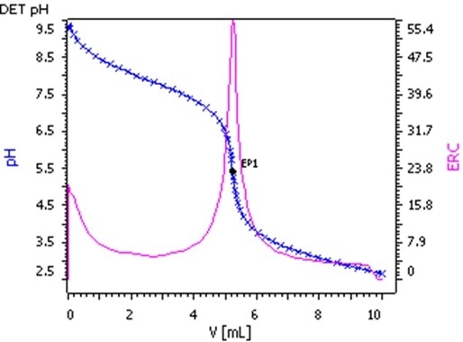 Dependent upon the expected content of nicotine, a sample weighing between 3-20 g is weighed into clean 120 ml disposable beakers, into which roughly 35 ml of ultrapure water is added. This solution gets stirred for 2 minutes before being titrated with c(HCl)= 0.1 mol/L until after the equivalence point.