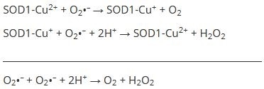 Superoxide radical (O2•–) is more toxic than the oxygen (O2) and hydrogen peroxide (H2O2) products. Another enzyme subsequently converts H2O2 into O2 and H2O.5 In the first step of the reaction the Cu active site is reduced from Cu2+ to Cu+, then oxidized back to Cu2+. A bridging imidazolate ligand6 is used to link the Zn ion to the Cu ion followed by a secondary bridge where Asp 83 is hydrogen-bonded to both a Zn ligand and a Cu ligand.7 The Zn site is not redox active but stabilizes the SOD1 structure.8