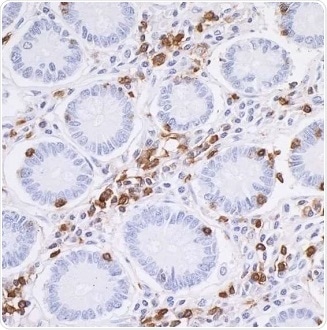 Figure 2. Detection of CD45 in an FFPE section of human small intestine by IHC. Antibody: Rabbit anti-CD45 recombinant monoclonal antibody [BL-178-12C7], Cat# A700-012. Detection: DAB. Image Credit: Bethyl Laboratories Inc.