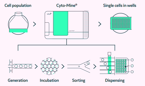 Cyto-Mine® delivers an entirely integrated microfluidic workflow of single-cell encapsulation, incubation, assay, categorizing, imaging, and dispensing, with the ability to process up to tens of millions of single cells in one working day.