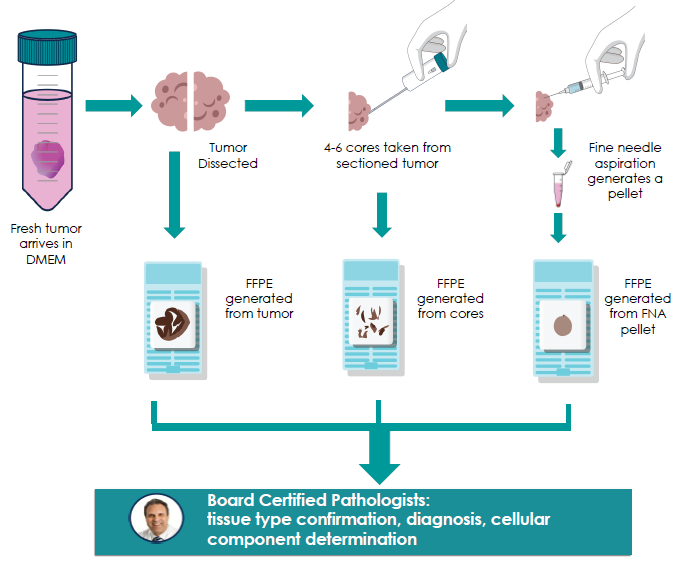 Laboratory-synthesized CNBs, FNAs, and resection FFPE blocks were processed and assessed using a standard histology review and a pathology review. This two-level assessment was conducted by a board-certified pathologist for tissue-type confirmation, diagnosis, cellular component estimation/determination and to guarantee tissue origin and diagnosis were consistent with clinical data.