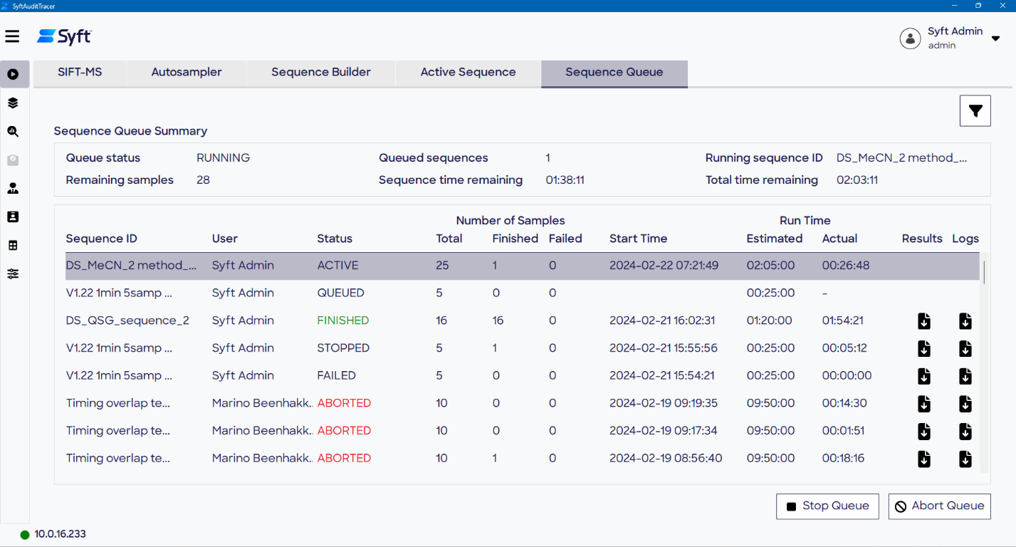 Figure 5. Active Sequence (top) and Sequence Queue (bottom) allow the progress of the current sequence and queued sequences, respectively, to be viewed. Image Credit: Syft Technologies