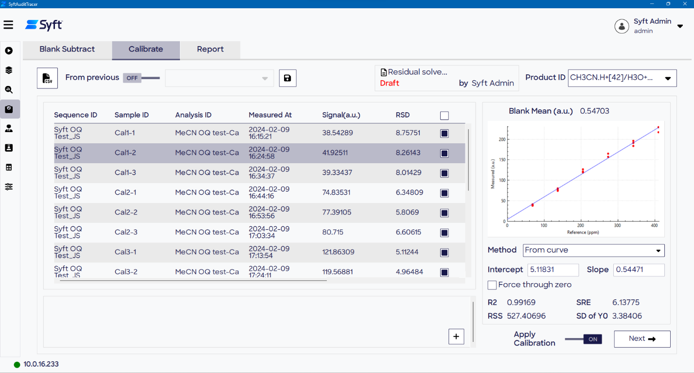 - From previous: A calibration file from a previous analysis can be applied, where either 1 or 2 above have been selected for each product ion, respectively. Calibration files are controlled per the 21 CFR Part 11 standards applied to other files in SyftAuditTracer. For instance, it is not possible to edit or delete files.