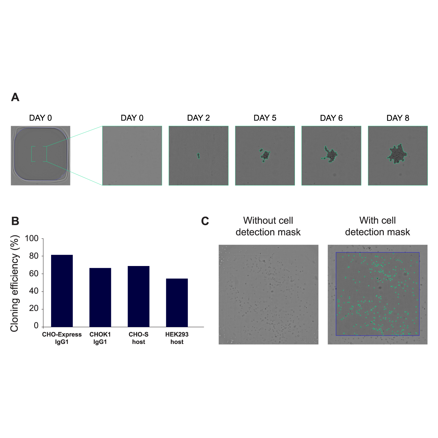 A) UP.SIGHT 2nd Gen well bottom images at different timepoints after CHO single cell dispensing. B) Typical cloning efficiencies after medium optimization for several suspension cell lines. Cloning efficiency values expressed as percentage of wells occupied by colonies on 384-well plates after 14 days of cloning. N=3-5, error bars: s.e.m. C) Representative cell count image with and without cell detection mask (2.5x10⁴ cells/ml). All image analysis performed with C.STUDIO. Image Credit: CYTENA GmbH