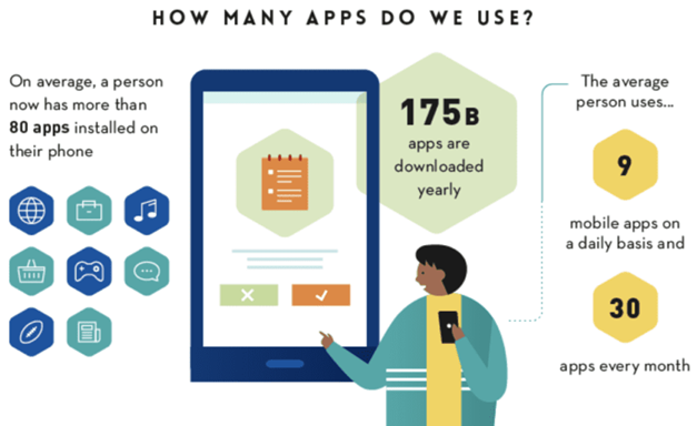 Buildfire.com states that an average user downloads between 60 and 80 apps to their phone, using approximately nine apps per day and up to 30 each month.