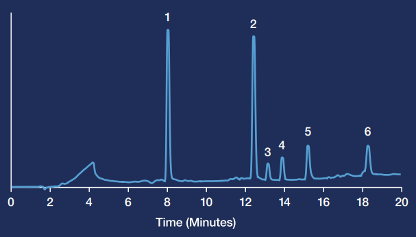 Evaluation of the stationary phase suggests a good separation between Angiotensin I and II biomarkers while offering further baseline resolution between the analytes that remain. The chromatogram also displays the peak shape and resolution an analyst can anticipate while using the PRP-3 stationary phase. In this example, Hamilton selected the 7 μm particle due to its minimal system back pressure (550 psi) providing the necessary resolution for isolation in an analytical analysis and a scale-up process.