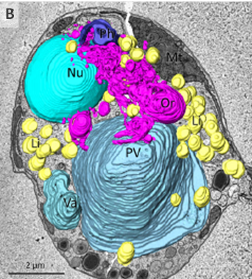 Fig.3: The interaction between colv organelles and cellular structures. A) TEM images of cells treated with lanthanoid nanocrystals (La). B) 3D reconstruction of 2 μm-thick slice from array tomography data set shows different organelles vacuoles and vesicles. Nucleus (Nu), mitochondrion (Mt), lipid droplets (Li), posterior vacuole(PV), cytopharynx (Ph) Colv organelle (Or) and smaller vacuole (Va). Image Credit: doi: 10.1128/mbio.01921-23.