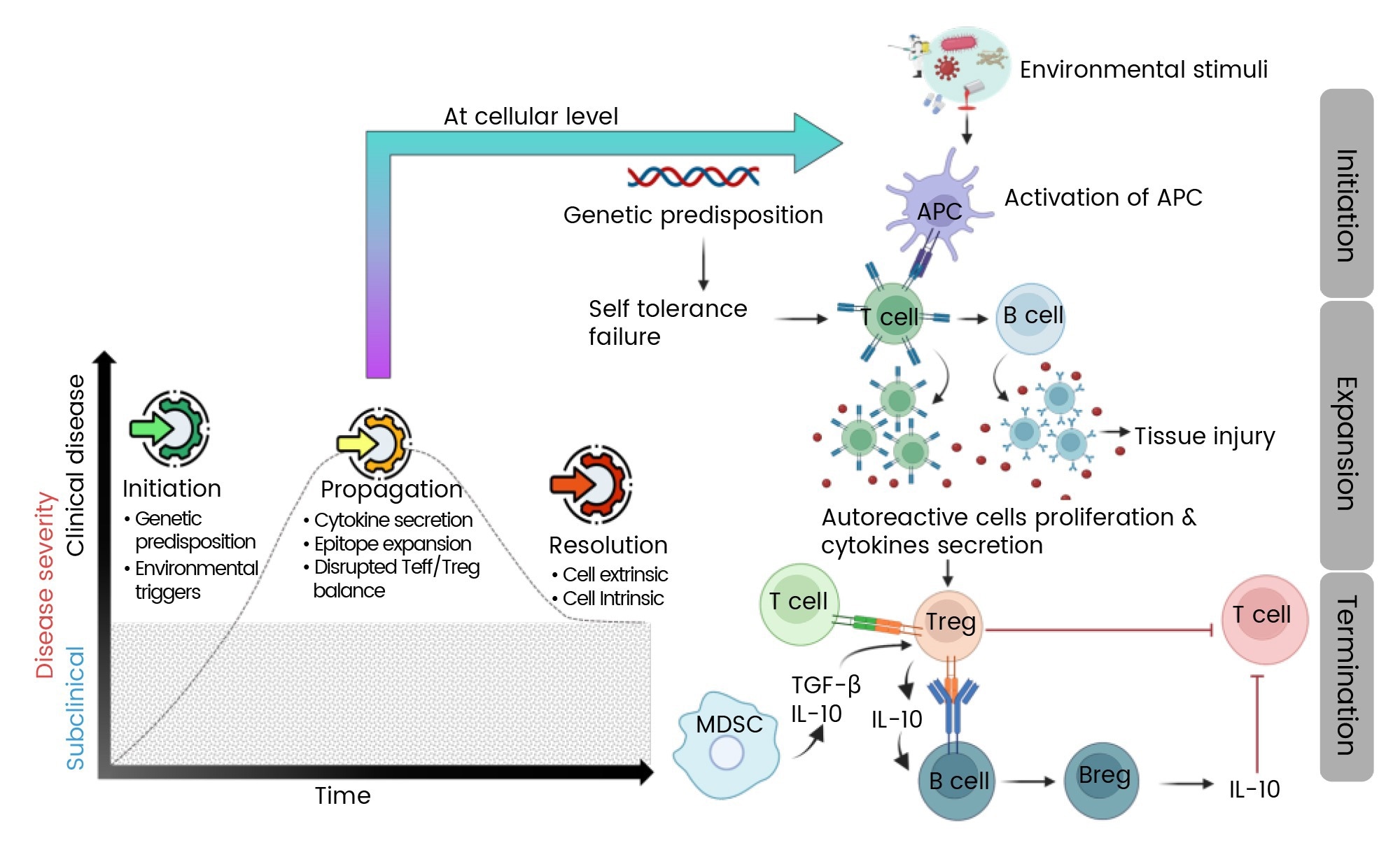When resolution is possible, it relies on the re-establishment of regulatory controls, primarily through regulatory T cells (Tregs) and regulatory B cells (Bregs). These cells secrete immunosuppressive cytokines such as transforming growth factor-beta (TGF-β) and interleukin-10 (IL-10), which play key roles in repairing tissue and dampening the inflammatory pathways that drive disease initiation and progression.