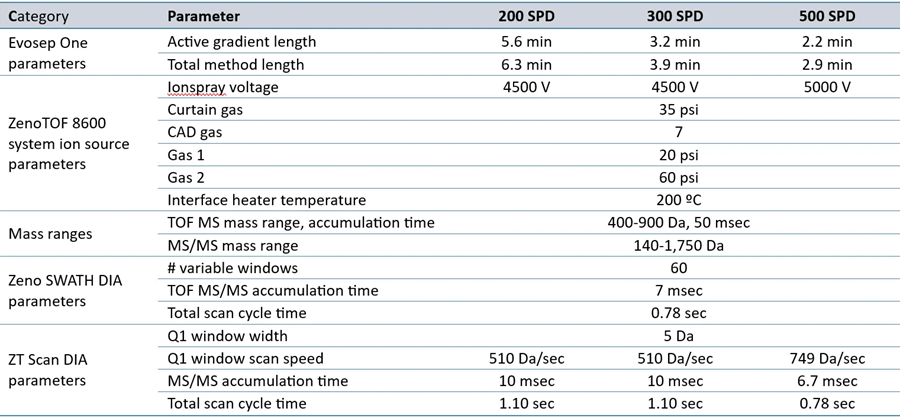 Zeno SWATH DIA techniques used 60 variable-width windows and MS/MS accumulation times of 7 milliseconds. ZT Scan DIA 2.0 methods were also examined for these loadings, with a focus on acquisitions using the stated SPD method (Table 1).
