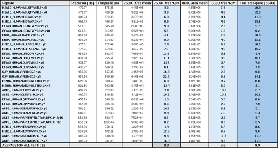 The repeatability (%CV) of triplicate injections was also compared. The table demonstrates that the average XIC peak area gain was 10-fold throughout this peptide panel, while the CVs across replicates improved from 9.3% on the ZenoTOF 7600+ system to 5.6% on the ZenoTOF 8600 system.