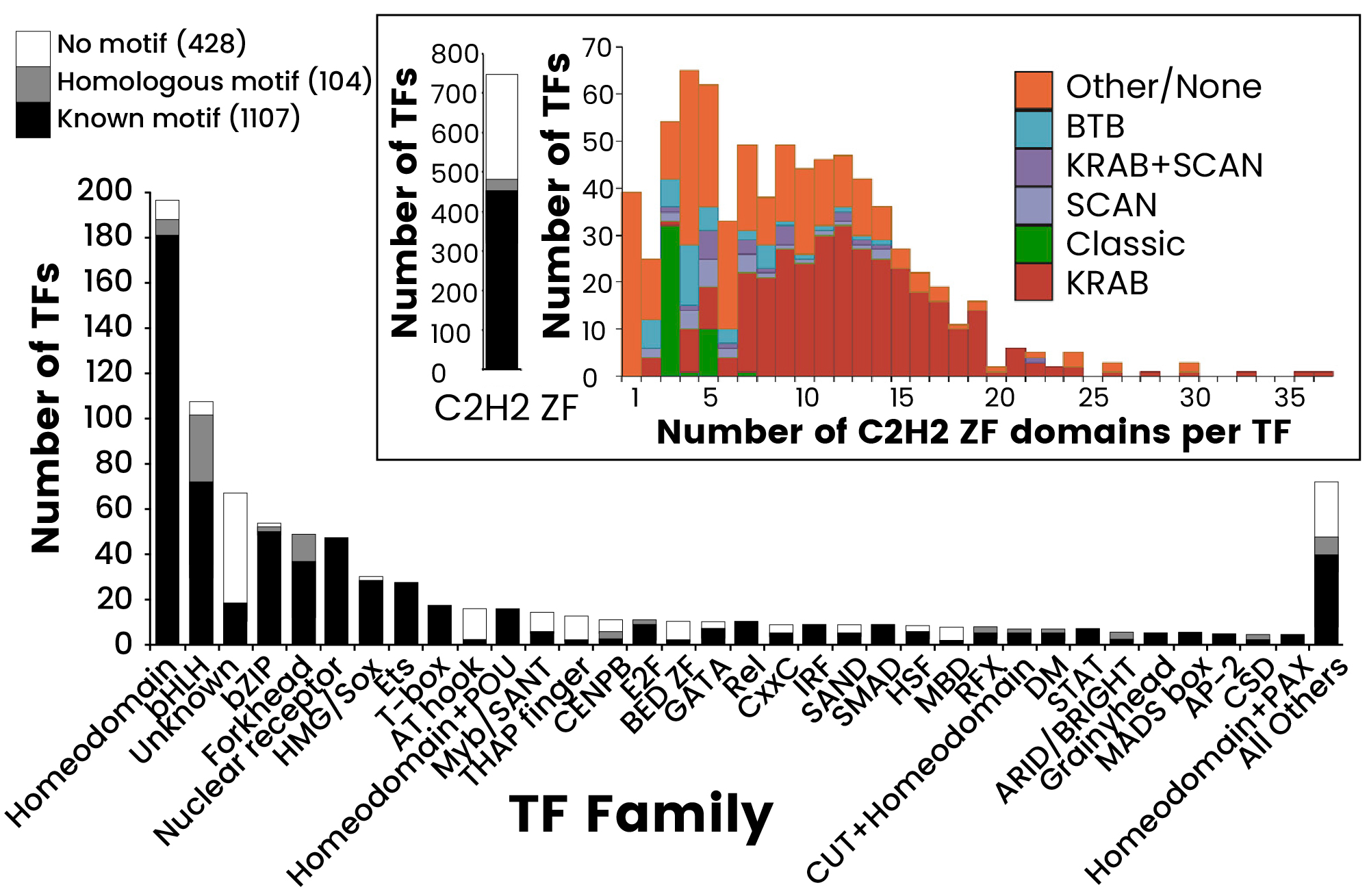 Figure 1. The Human TF Repertoire1. (A) Schematic of a prototypical TF. (B) Number of TFs and motif status for each NA-binding domain (DBD) family. Inset displays the distribution of the number of C2H2-ZF domains for classes of effector domains (KRAB, SCAN, or BTB domains); “Classic” indicates the related and highly conserved SP, KLF, EGR, GLI GLIS, ZIC, and WT proteins. Image Credit: Sino Biological Inc.