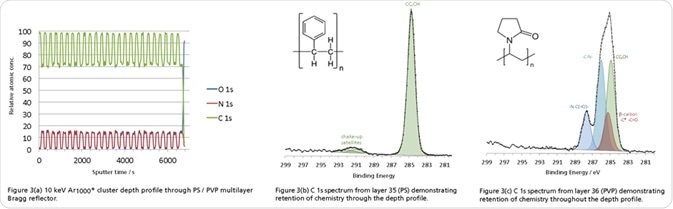 The PS & PVP layers were 328 nm and 288 nm respectively such that the complete structure was >15 um thick. Figure 3(a) shows the sputter depth profile through the entire structure to the glass substrate. The layer structure is retained throughout the depth profile and it is evident that the fabrication of the structure resulted in uniform layer thickness for each respective polymer layer. Figures 3(b) and (c) show the C 1s spectrum for layers 35 and 36 respectively, proving the chemistry of the polymer is retained during the sputtering process.