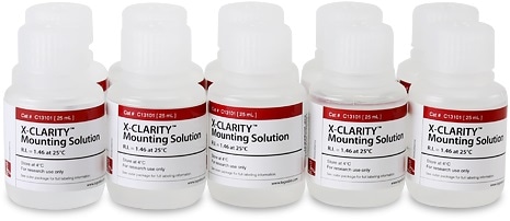 X-CLARITY™ Mounting Solution is a high quality, cost-efficient refractive index matching solution (RIMS) modified from the recipe developed by Yang et al. The refractive index (RI) of the solution is 1.460 at 25 °C and is stable over a wide temperature range. The X-CLARITY™ Mounting Solution minimizes photobleaching and preserves fluorescence signals, making it an ideal solution for clarified and labeled tissue samples.
