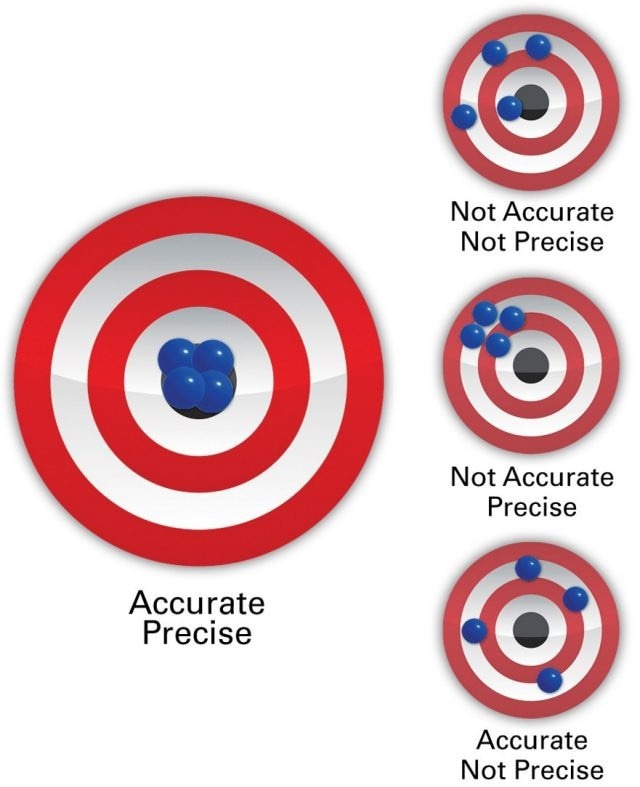 Accuracy is the measure of the closeness of the experimental value of the actual amount of the target analyte in matrix. It is a measure of systematic bias. Precision is how well the experimental values agree with each other and is a measure of random error. Together these parameters measure the total error of the assay, which in turn determines the Limit of quantitation (LOQ). Since the MRM technique spends nearly all the time measuring the target analyte, the result is an unbeatable LOQ in matrix; something you will routinely achieve on the EVOQ-TQ.