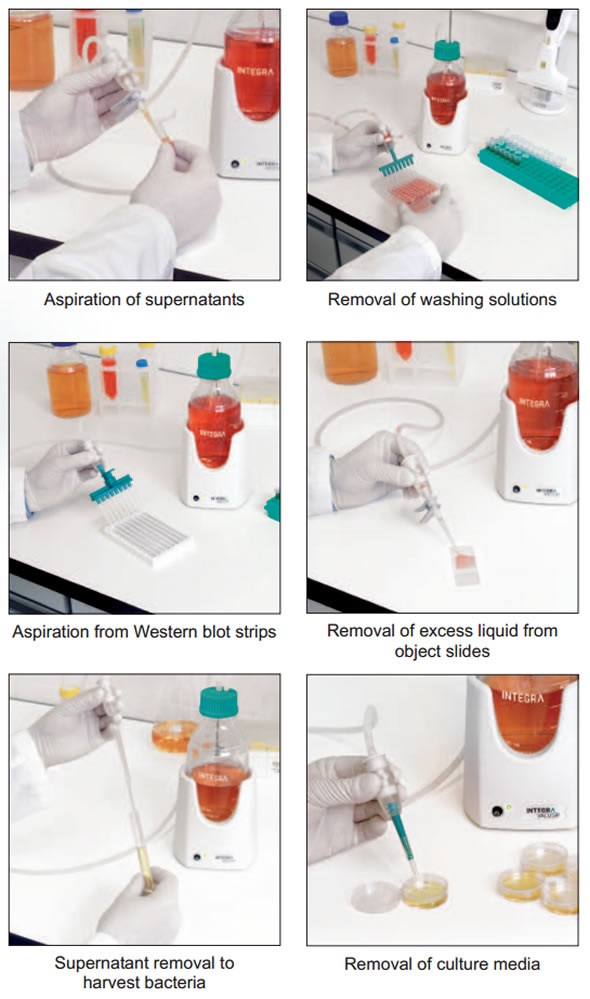 Aspiration of supernatants after centrifugation steps and removal of washing solutions from microtiter plates are examples of common laboratory applications.