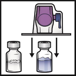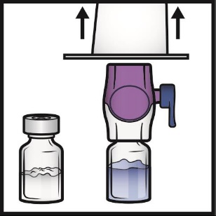 8. Turn the system over so that the diluent vial is on top. Quickly insert the purple
