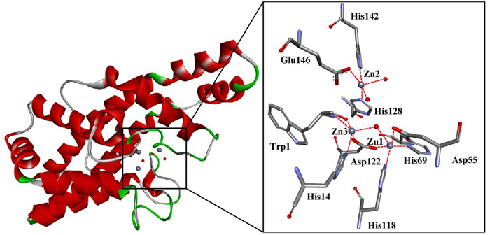 Figure 2. The PC-PLCBc structure (PDB: 1AH7). It has three catalytic Zn2+ ions and water (grey and red spheres) in the binding pocket. Image Credit: Charachakorn Eurtivong et al., in partnership with ELRIG (UK) Ltd.