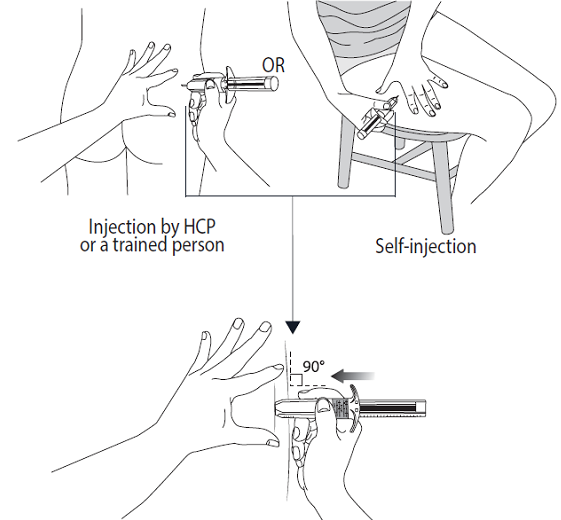 syringe to stretch the skin. Do not pinch the skin. Use a strong, straight dart-like motion to quickly insert the needle perpendicular to the skin (90° angle), all the way into the skin.It is very important that you insert the needle completely. You should not see any needle once it is fully inserted.