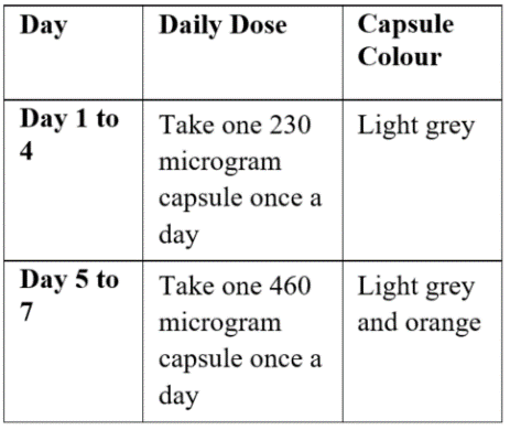 Treatment initiation pack is a wallet pack containing 7 capsules: 4 x 230 microgram