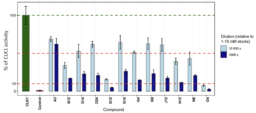 - Initial 100× dilution screen in ADP-Glo → 12 compounds with CLK1 activity <10 %