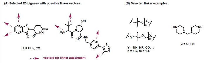 - Commonly used binders for E3 ligases are represented (CRBN, VHL)