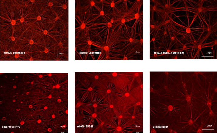 The unaffected donor cells displayed uniform cultures with large cell bundles and thick cabling while the C9orf72 carrying donor cells (ax0073) displayed smaller irregular cell-body clusters that are dispersed with thinner cabling between cell bundles. The SOD1 and TDP43 donor cells displayed more heterogenous morphologies each with varied cluster sizes and neurite characteristics. The C9orf72 donor cells (ax0074) displayed fewer uniform cultures, with smaller bundles and fibrous neurites.
