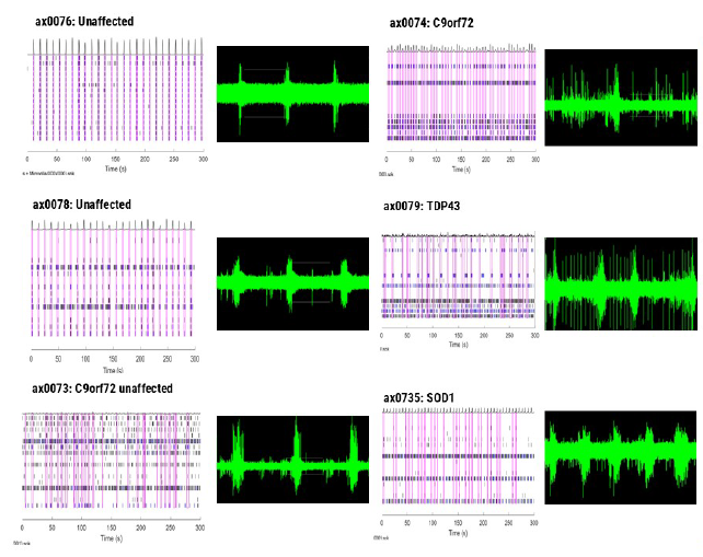 Spontaneous Neuronal activity (SNA) and Multi-electrode array (MEA) analysis displayed overall firing rates, synchronization of firing, length of bursts and amplitude of bursts consistent with the cells' phenotype. Specifically, the ALS donor cells displayed a reproducible loss of synchronous firing and different degrees of hyperexcitability.