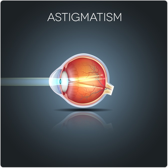 Astigmatism is a refractive error that creates asymmetric blur in the vision due to the irregular corneal curvature/shape (corneal astigmatism) or the lens (lenticular astigmatism). Due to this condition, the light rays that enter the eye fail to converge at a single focal point on the retina and form two foci instead. The lack of a single focus point results in the formation of blurred images on the retina.