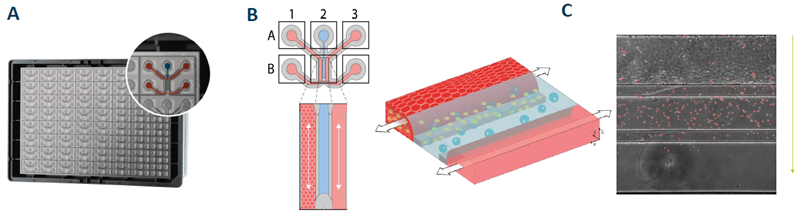 A. The OrganoPlate 3-lane 64 platform with zoom-in on individual tissue chip. B, C. Representation of endothelial vessel, perfused with fluorescently labeled immune cells, aligning next to an extracellular matrix lane, comprising of embedded PVMs or target protein. Chip design allows for free migration of cells between lanes. Image Credit: Image courtesy of W. Strijker et al., in partnership with ELRIG (UK) Ltd.