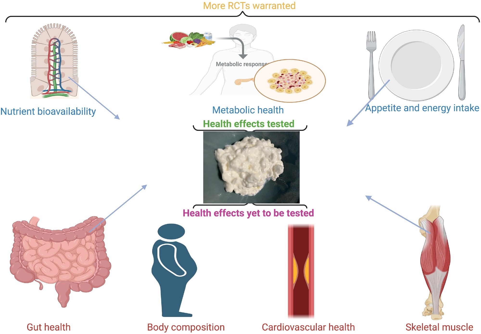 Summary of the health effects tested and health effects yet to be tested pertaining to cottage cheese. To date, investigations have been performed on the effects of cottage cheese on nutrient bioavailability, metabolic health, appetite, and energy intake; although further randomized controlled trials are warranted due to investigations being performed in small, niche study populations. There have been no investigations of the impact of cottage cheese on gut health, body composition metrics such as weight loss, cardiovascular health and skeletal muscle, investigations which are arguably warranted to garner a detailed picture of the impact of cottage cheese in health.Summary of the health effects tested and health effects yet to be tested pertaining to cottage cheese. To date, investigations have been performed on the effects of cottage cheese on nutrient bioavailability, metabolic health, appetite, and energy intake; although further randomized controlled trials are warranted due to investigations being performed in small, niche study populations. There have been no investigations of the impact of cottage cheese on gut health, body composition metrics such as weight loss, cardiovascular health and skeletal muscle, investigations which are arguably warranted to garner a detailed picture of the impact of cottage cheese in health.1