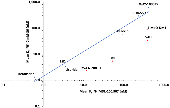 Figure 5. Comparison of inhibition constants (Ki) determined by [3H]cimbi-36 versus [3H]MDL-100,907 binding. Trendline excludes 25CN-NBOH, DOI, 5-HT & 5-MeO-DMT.