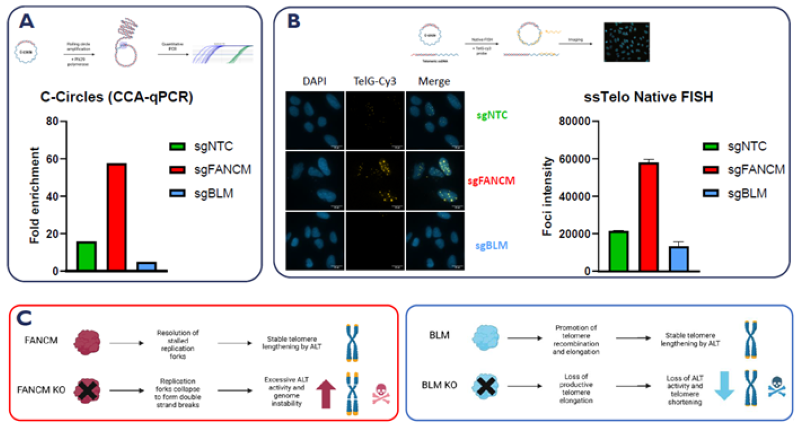 A. CCA-qPCR assay. C-circles are amplified from genomic DNA by rolling circle amplification, and fold change is detected using telomere-specific primers. B. Representative images from the Native-FISH assay where telomeric ssDNA is detected as nuclear foci by a TelG-Cy3 probe in U-2OS cells. Quantification of TelG-Cy3 foci intensity in U-2OS cells treated with control sgRNAs. C. Schematic depicting the function of established ALT control genes FANCM and BLM. Image Credit: Image courtesy of Manners O et al., in partnership with ELRIG (UK) Ltd.
