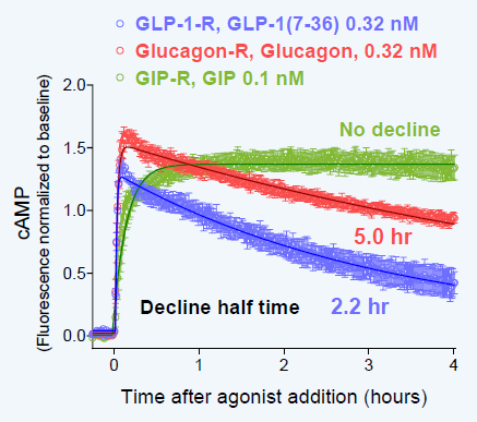 - Different cAMP dynamics for GLP-1, glucagon, and GIP receptors.