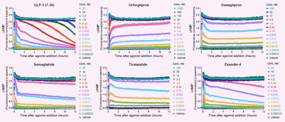 - Radically different time course curve shapes for the different agonists, from profound decline of cAMP for GLP-1 (7-36), to sustained cAMP for orforglipron. Note the slow rise for orforglipron, and the peak-and-decline time course for other agonists.