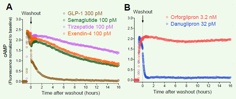 - For the small molecules (B) orforglipron signaling was completely wash-resistant, whereas danuglipron signaling declined rapidly, suggesting different receptor binding and regulation mechanisms.