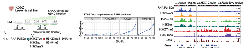 Left: Experimental setup: K562 cells treated with SAHA (4 doses + DMSO control); triplicates of each pooled and processed. Center: SAHA dose–response curve shows global histone acetylation changes. Right: Genome browser (IGV) tracks from combined data across all 15 samples show expected mark enrichment. Image Credit: Image courtesy of Banushee Kumar et al., in partnership with ELRIG (UK) Ltd.