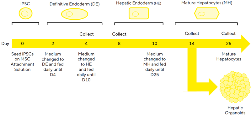 - On day 14, cells can be expanded to mature hepatocytes or extracted and cultured in a 3D matrix to create hepatic organoids. Collection timestamps are marked for characterisation analysis.