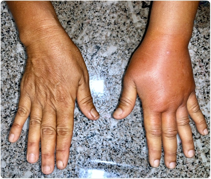 In mild cases, patients may notice that it is more difficult to fit into clothing than usual, particularly sleeves, pants, or a bra. Additionally, accessories such as a ring, watch, or bracelet may feel tighter than usual. The skin usually remains soft and elastic in the early stages and raising the affected area often helps to relieve swelling and associated discomfort.